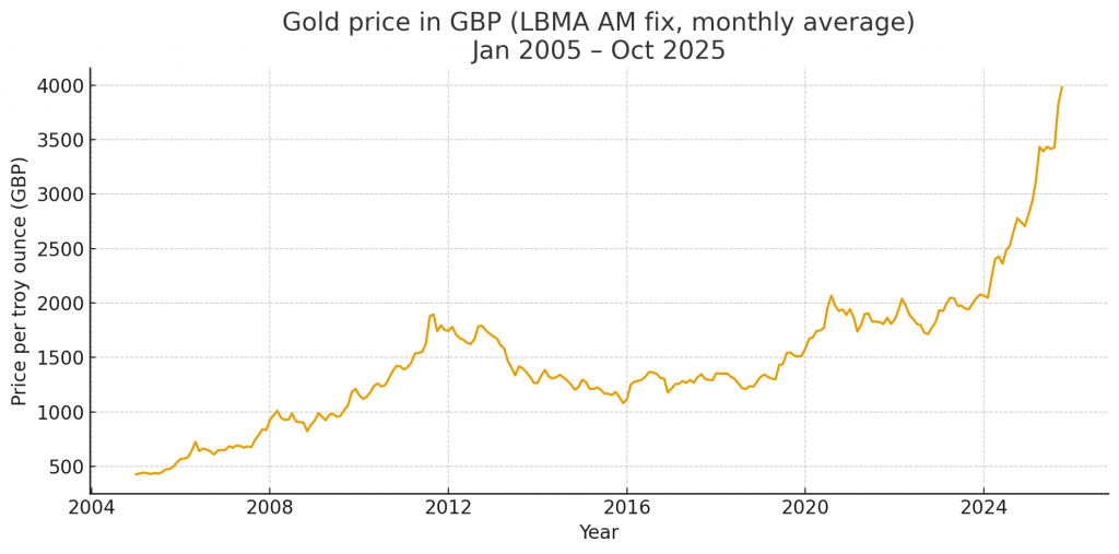 Back then, an ounce of gold cost around £400. Today, in late 2025, it is close to £4,000 — almost a ten-fold rise.