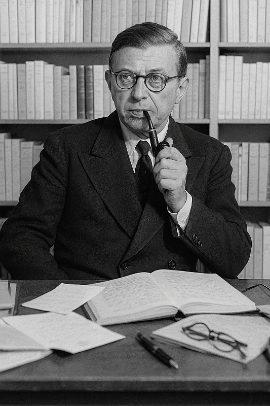 Early fiction (1930s): Sartre’s early stories and novels were not expressions of existentialism as a finished philosophy but explorations of a problem — how to find meaning in a meaningless universe. Works such as La Nausée (1938) and Le Mur (1939) are internal dialogues set against an interwar Europe adrift in cynicism and rising authoritarianism. In them, Sartre depicts the raw experience of consciousness confronted by absurdity: freedom without direction, awareness without purpose.