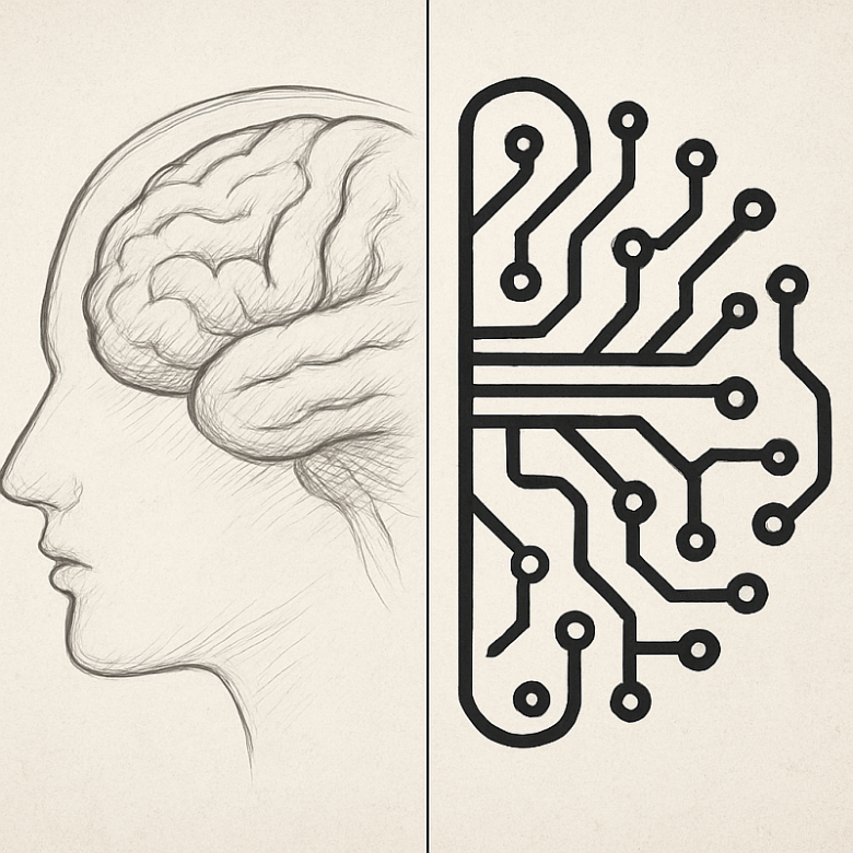 A visual reflection on the deepest difference between humans and AI: the human mind grows through experience and becomes itself over time, while AI arrives fully formed, pre-structured, and without a lived past. This split image captures the contrast between organic consciousness and engineered intelligence.